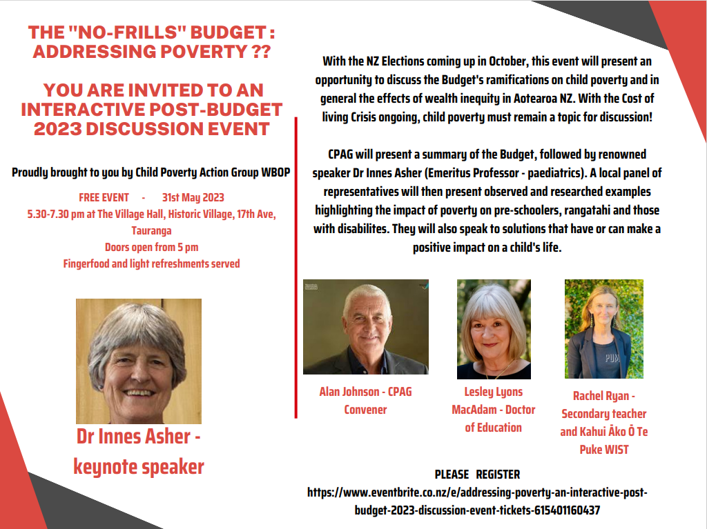 CPAG WBOP invites you to their 2023 post-Budget event – an analysis, local speaker panel and solution-focused interactive table discussions.